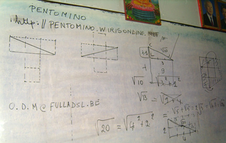 Graad 9. Heel aandachtige klas. Heel leuke les. Uitleg gegeven over het versnijden van 1 en 2 pentomino's tot een vierkant.
