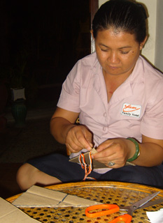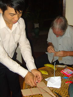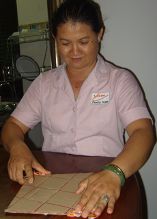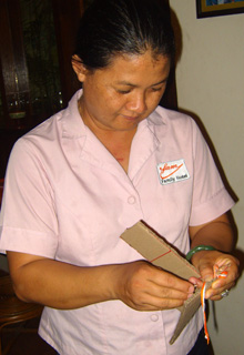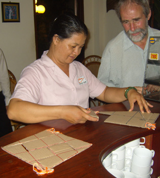 Met karton van dozen langs de straat en koordjes van Boeddha worden versnijdingen gemaakt.