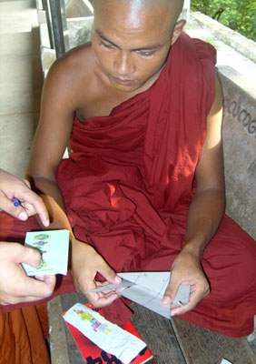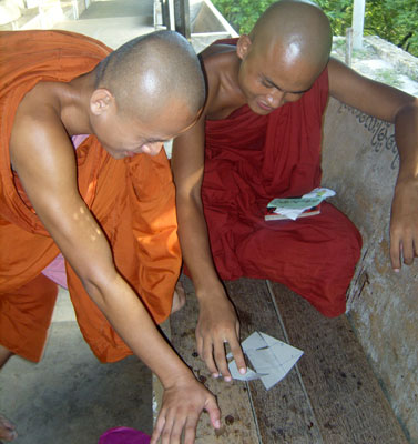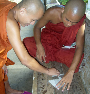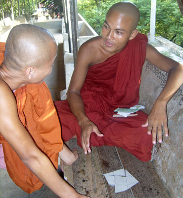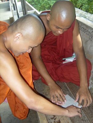 Monniken tijdens de afdaling van de 236 m hoge Mandalay Hill wilden hun Engels