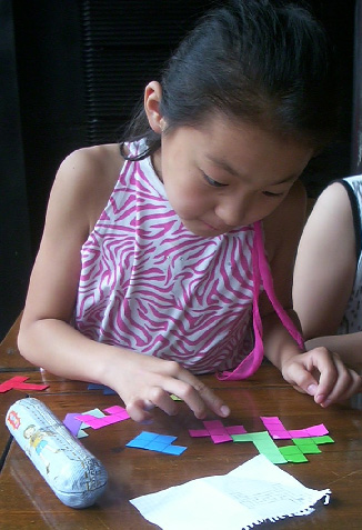 De vakantiewerkboek rekenen werd opzij gelegd en de pentomino-hond kreeg alle aandacht.