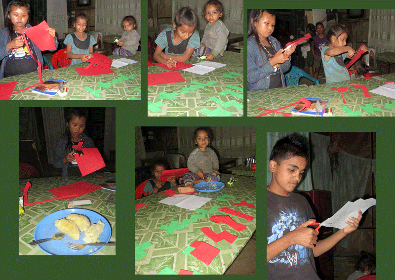 Het tekenen was geen groot succes, dan maar knippen (niet tussen de soep en de patatten maar met de zoete patatten)