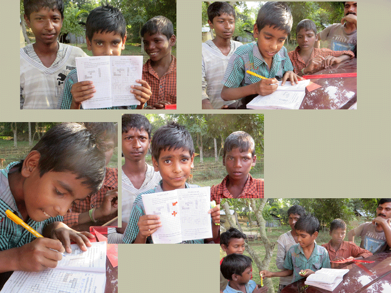Middageten op weg naar Mon. Jongetje volgde juist klas 5. Hij kon het boekje goed gebruiken en onze chauffeur zag dat het goed was.