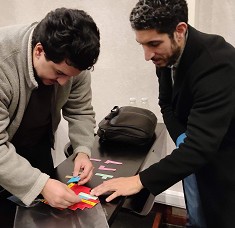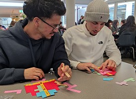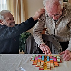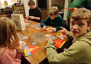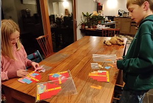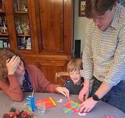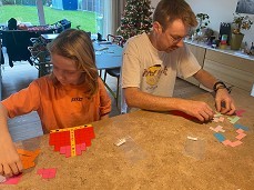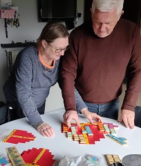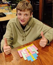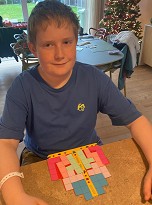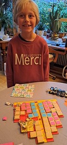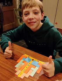 anderen dat het ok was als er twee dezelfde kleuren naast elkaar lagen. Uiteindelijk is het ons allemaal gelukt om de pentomino's in de mijter te doen passen."