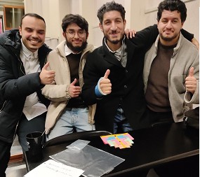 voortklinkt in wiskunde nu". We gingen naar de aula waar we onze beloofde mijters uitdeelden. Na de lezing